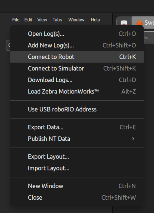 Of course we can see what the robot is doing physically, but sometimes it is useful to see internal states like mechanism positions, sensor readings, and other telemetry data. For this AdvantageScope is recommended. Launch AdvantageScope and connect it to the robot code selecting File > Connect to Robot.