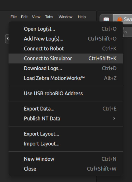 While the Sim GUI is useful for basic testing, it does not provide a visual representation of the robot in a field or let us see internal states like mechanism positions. For this AdvantageScope is recommended. Launch AdvantageScope and connect it to the robot code selecting File > Connect to Simulator.