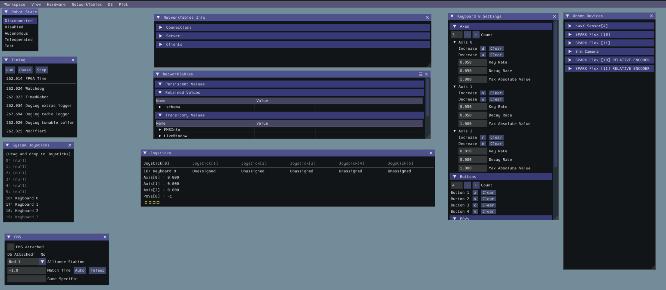 Testing in simulation is a great way to catch issues before they become dangerous on the physical robot. It also allows for faster iteration times since we do not have to wait for the physical robot to be available. Our simulation environment is built using WPILib's built-in simulation tools along with some custom code to better integrate with our robot codebase.