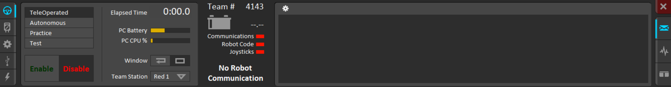 The Driver Station is the primary operator interface with the robot. It can be opened on a laptop connected to the robot network. It is used to enable/disable the robot along with transmitting the joystick inputs to the robot to be used in robot code. This is a simple overview of the Driver Station, but more documentation can be found here
