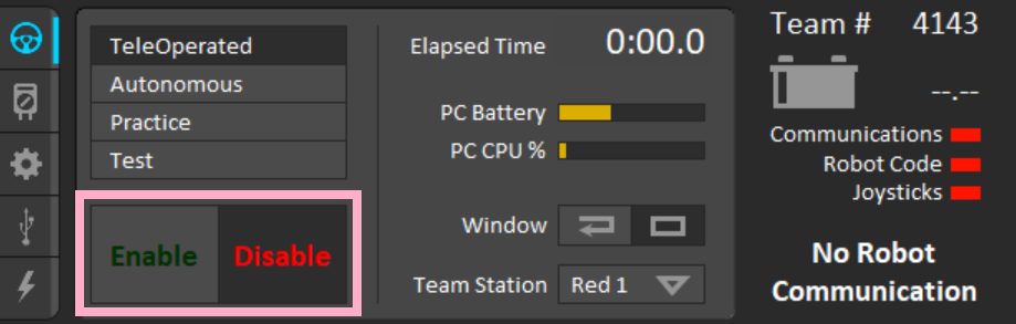 [ + ] + \- Enable the robotEnter- Disable the robotSpace- Emergency Stop- This will require the roboRIO to be rebooted to re-enable the robot